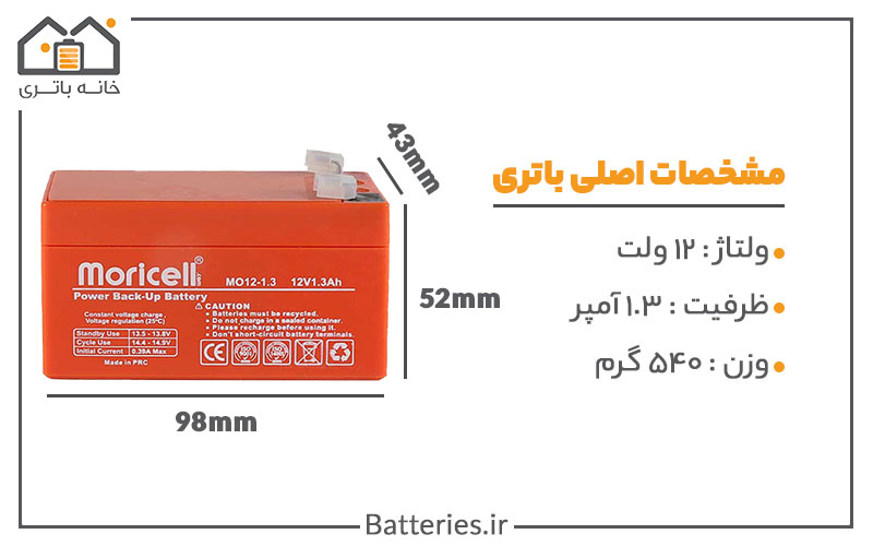 ابعاد باتری خشک سیلد لید اسید 12 ولت 1.3 آمپر موریسل